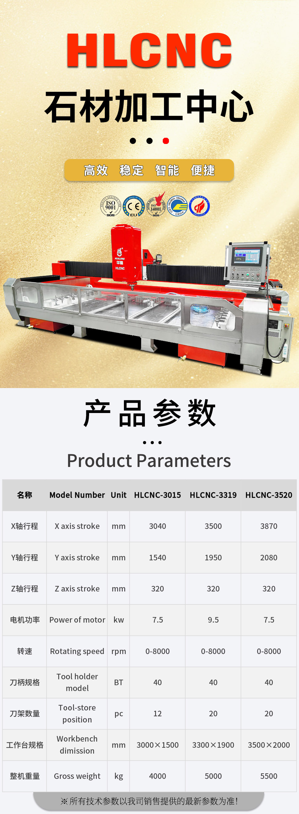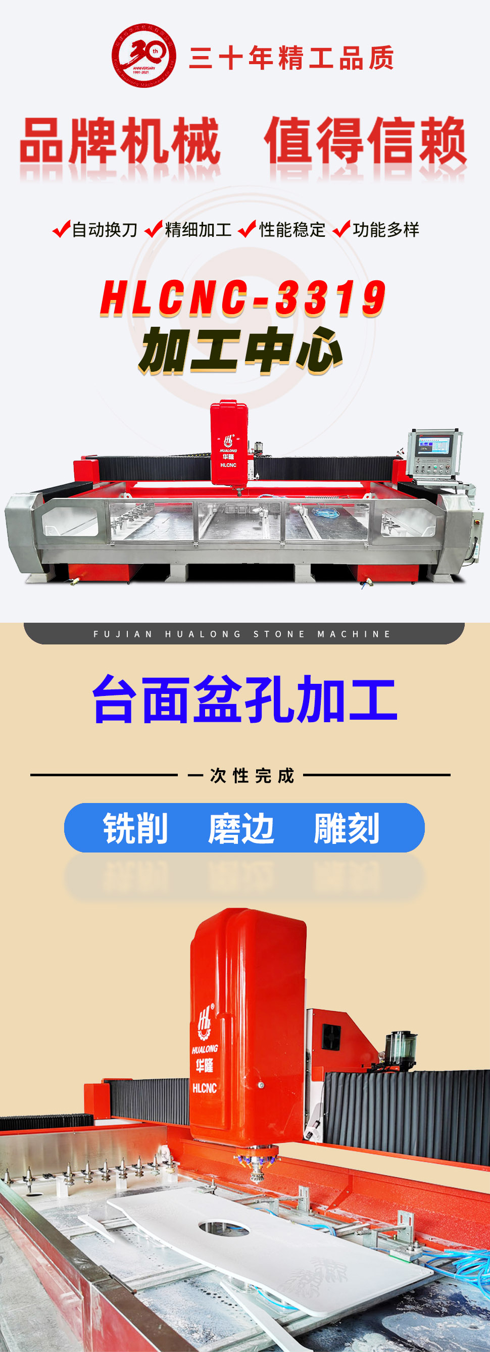 HLCNC-3319  is a CNC milling and edge polishing centre designed for contouring, cutting and turning with three interpolated axis offering users the possibility of multiple and complex machining operations which would otherwise require several machines.  It's suitable for processing all kind of stone slab coutertop, such as kithen countertop, bath countertop, cabinet countertop, bar counter, table,  windowsill,  door sets etc.   Relief engraving like stone background wall relief, European style edging etc. is available too.